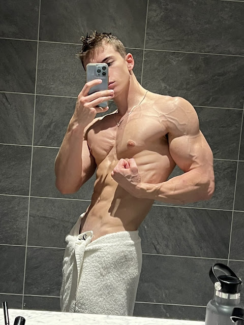 A favourite time to get a picture is just post-shower: sometimes after a workout, more often at home in the bathroom when that mirror just cries out for a progress selfie. Sometimes they're back in the bedroom, or by the pool. Or in the sauna. Whatever...